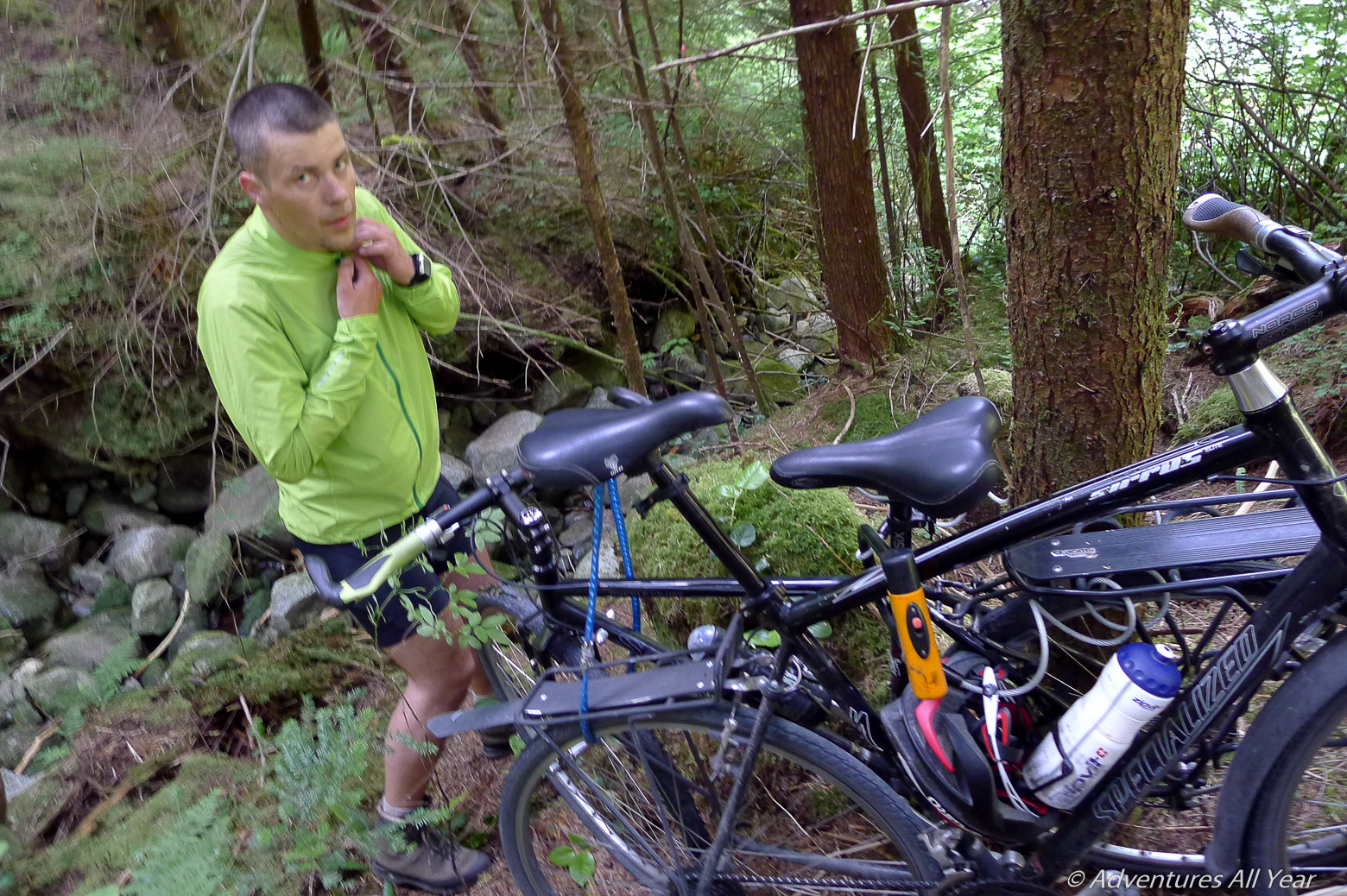 This hike is stiff, long, demanding, rooty, bluffy, gnarly… In other words, typically north-shore. However, don’t be put off by the difficulties as there are very few better places which offer this kind of big mountain solitude so close to the city. You will need a bike to do this as a day trip and even with that budget a 10-hour day. Timing of things is important here: the parking gate locks at 9PM (summer months) sharp so you want to be back at your car and out by then. Start at the Lower Seymour Conservation Reserve parking lot. Take the paved Trailway to salmon hatchery and the Bear Island Bridge, 10 km total (see the map HERE). Once on the other (east) side of the river, push bikes a very short uphill until you come out again on a wide gravel road. Turn right on the road and bike about 200 m downhill, just before the first sharp turn in the road. From here, look left for flagging and a trail starting in the forest. Stash your bicycles here.