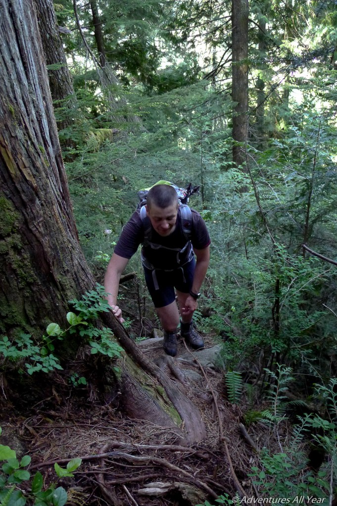 After short 15 mins of hiking you will come to a pair of giant old cedars, standing next to each other like a lifelong couple, the General and his Wife. They are truly remarkable living creatures. Please hug them for me if you go. From this point on the trail offers only one direction to go – up. And up it goes, over the roots, rocks and slabs. Luckily, the steepest sections have a fixed rope to hold on to and they are of great help. The trail is well marked and fairly easy to follow. However, when in doubt, do stop and look around for the next flagging to make sure you’re still on the trail, it will save you tons of trouble should you veer off the route.