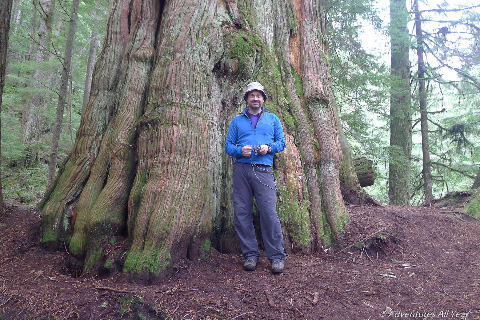 Starting at the top of Mountain Highway and from the Mt. Fromme mountain biking parking lot, take Big Cedar Trail (on your right, marked). After about 4km (1 hour if you are a fast hiker) you’ll arrive at a massive tree which gave the trail its name.