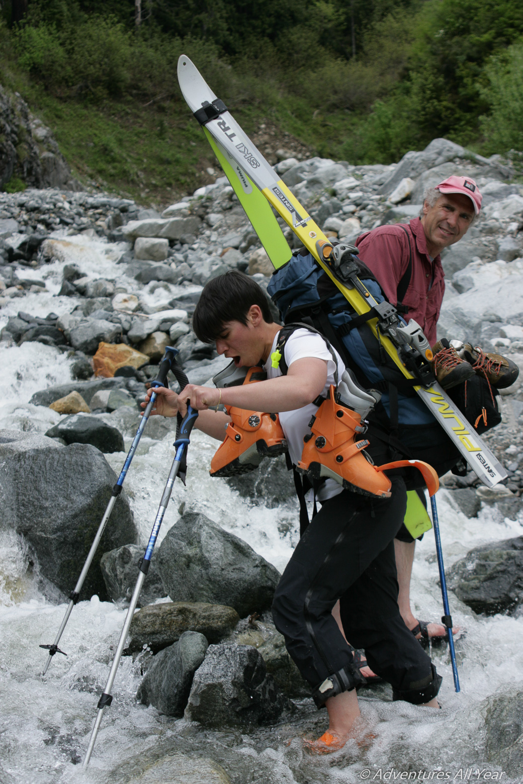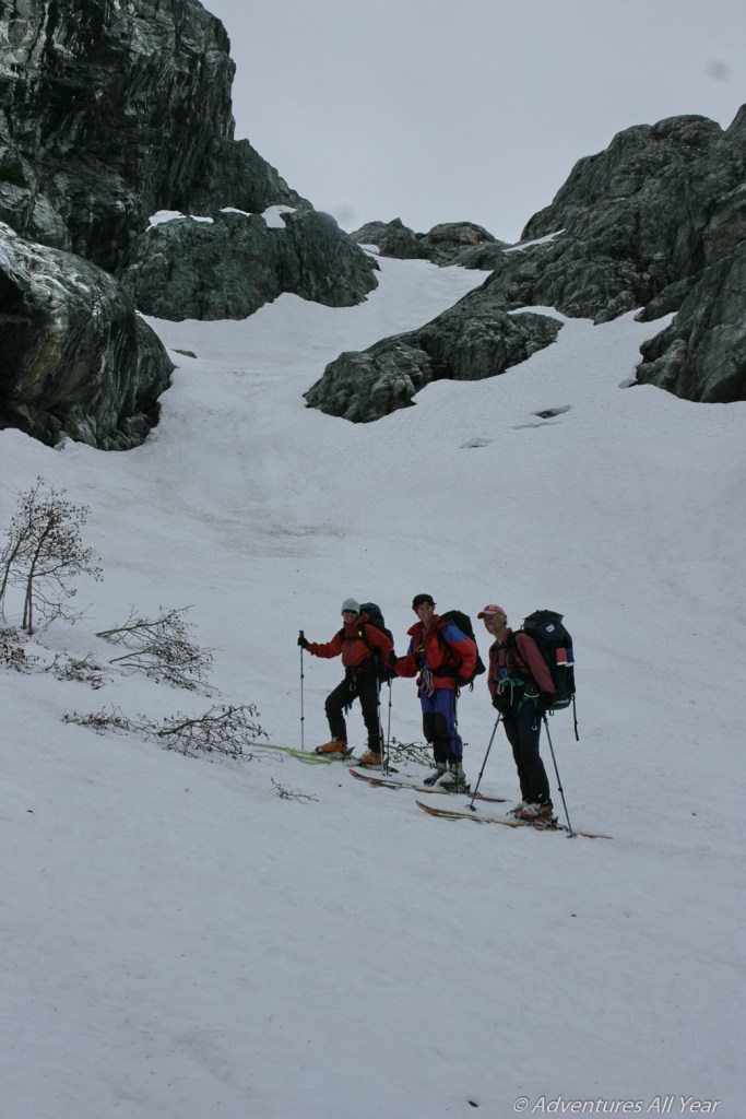 To descend from the divide we used a ridge that stretches S from the gap on the E side of Porterhouse Peak. We stayed high on the W slopes of the ridge, always traversing back to the ridge where possible and reasonable, avoiding cliffs and rock bands. It turned out to be a relatively easy and safe way down past the Porterhouse icefall. We exited the glacier basin via a ‘gate’ (N50 01.951 W123 32.147) between bands of rock that constrict its S end and skied out via a narrow chute that most probably hosts a small waterfall in summer.