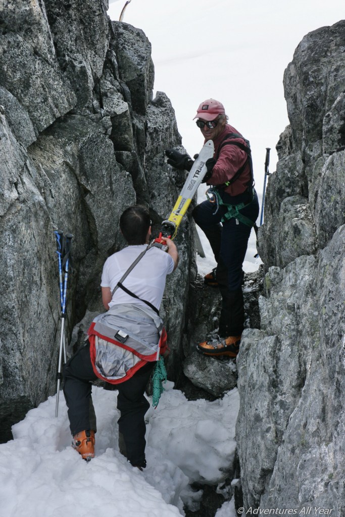 Next morning, while packing tents, Clé managed to drop one of my tent poles. Not a big deal, except – she dropped it and it glided and glided over spring snow for about 500 vertical meters, all the way to the valley bottom. I did not have enough willpower to go down and retrieve it – a decision we came to regret the very next night.