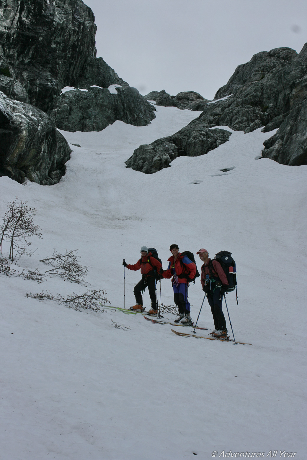 To get up to the col W of Amicus Mtn we had to do a nasty long bootpack as the terrain was too steep to skin up and prone to wet snow sluffs under the snow conditions we encountered. The weather caught up with us at the col W of Amicus Mtn so we made Camp 3.