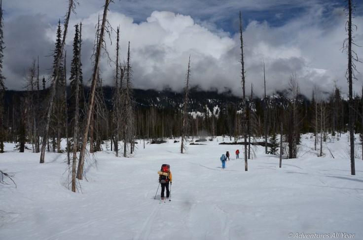 After being tried by the Job Creek we finally saw a clear way out and rejoiced upon emerging in the Lillooet River valley. Feels like we’re almost out but there is still so much work to do. We follow the flats on the west side of the river, crossing Affliction Creek and a couple of its channels / tributaries without a problem. We start seeing some snowmobile tracks. They were all aiming up the Affliction Creek valley on an old road bed.
