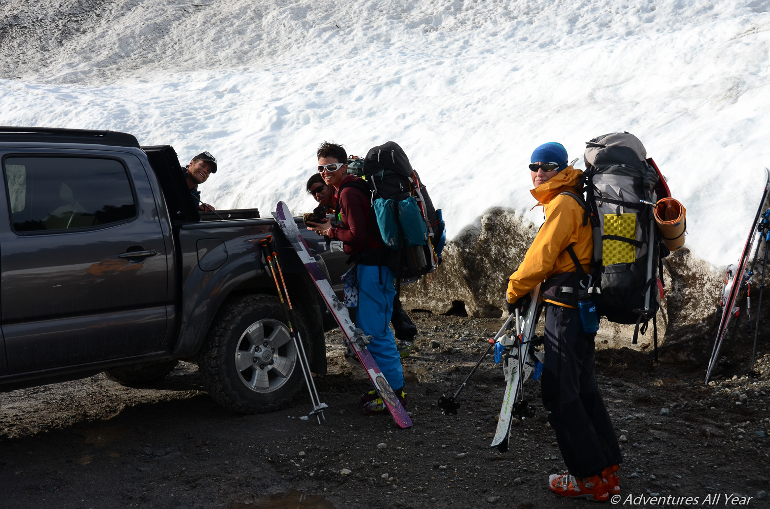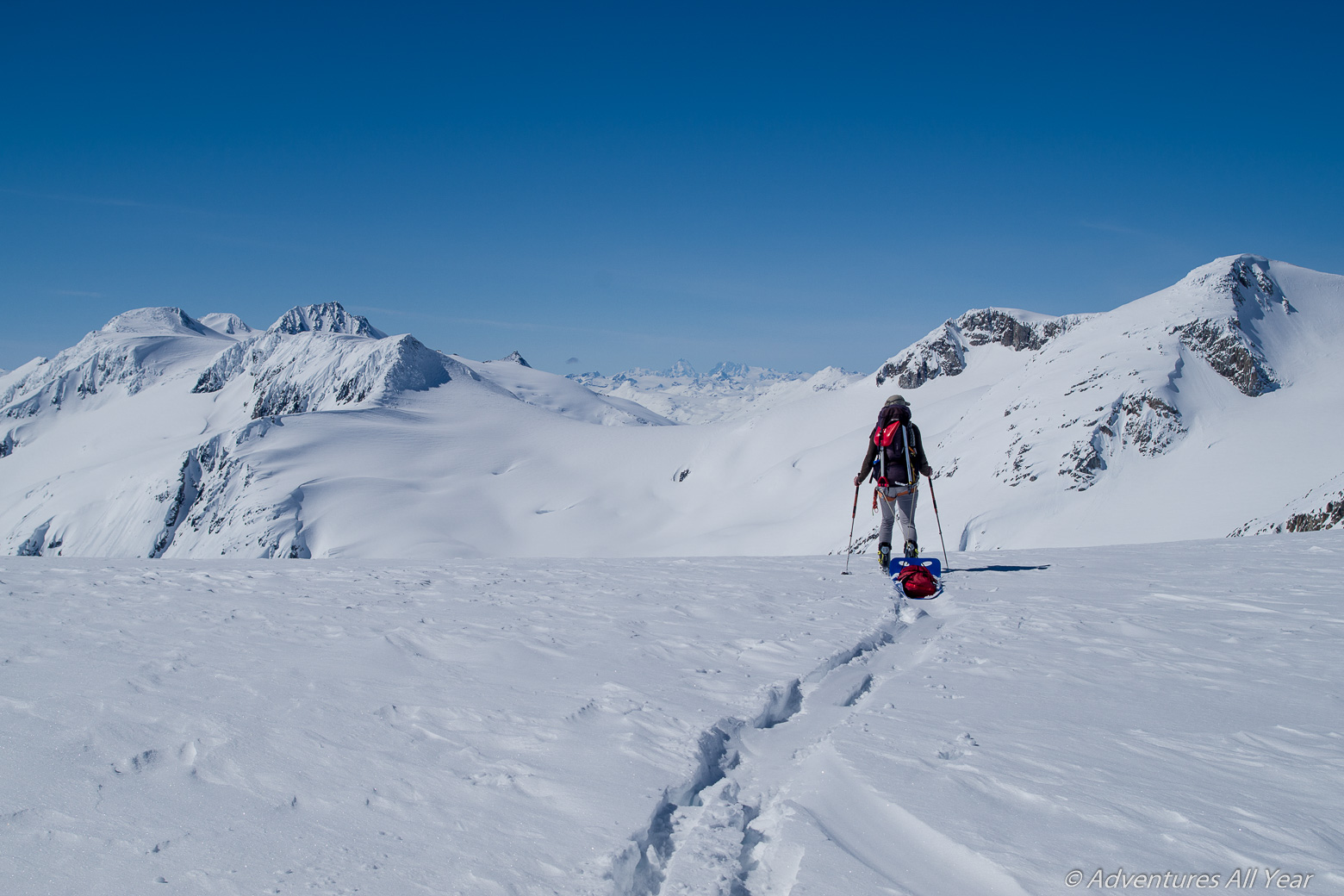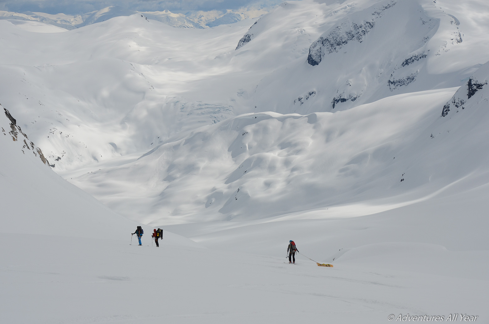 The mellow ridge to Pier Mtn is negotiated easily (we are also well rested 😉 and the ski run down to Bridge Glacier very enjoyable. Here we each get an opportunity to make friends – best ski buddies – with our sleds to the point that they are given nicknames. It is here that the Flying Burrito earns its name. So does PITA. We laugh, act silly, take pictures.