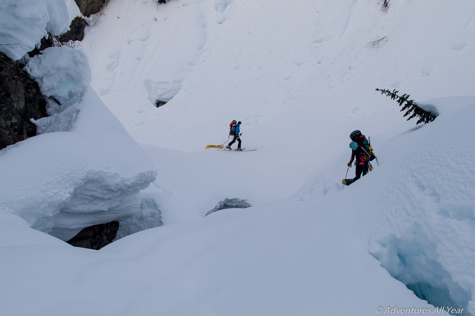A 4:30am wake-up call is met with some poorly masked discontent and audible growling. However, we all know we need to get going in order to clear the W Salal Creek canyon before it warms up too much. It is a good terrain trap with steep walls around it. As we pass through the canyon around 11am the snow starts to soften up and sluffs from the sides. A party from 2014 recommends this canyon as the preferred way out (or in) but be warned that the canyon is tight with not much room for maneuvering and no escape route. Once you’re in, you’re in. The convenience of this route also much depends on the snow level. At the time we were there (mid-April) the creek cover already had 2-3m deep gaping holes with running water at the bottom. Our sleds LOVED checking those out.