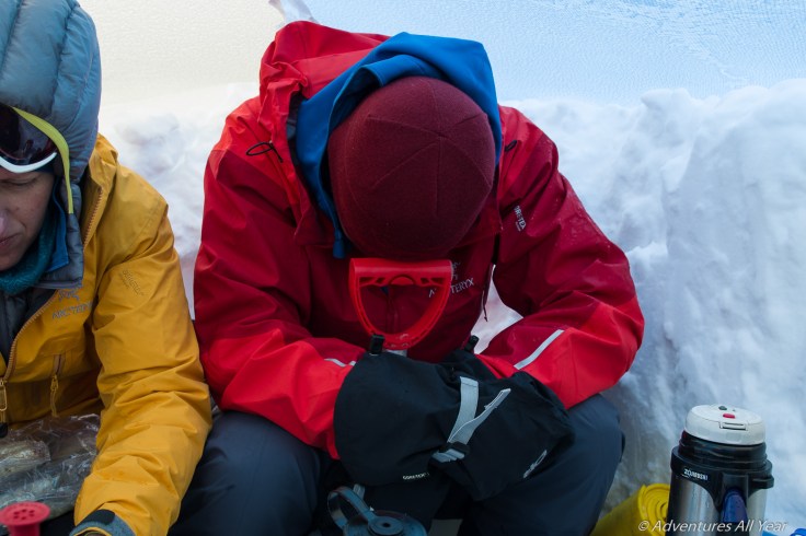 All the fun and action happens at night when we need to assign a midnight shift to clear snow off the tent to prevent it from collapsing. At midnight, one of us dons, inside the tent, a full body weather protection outfit including hat, gloves and goggles. The unlucky individual is then unceremoniously shoved outside the tent to fulfill his/her shoveling duties. After the job is done the person is begrudgingly received back inside the tent where they undergo an assisted gear doffing procedure. The cycle repeats at 3am and 6am.