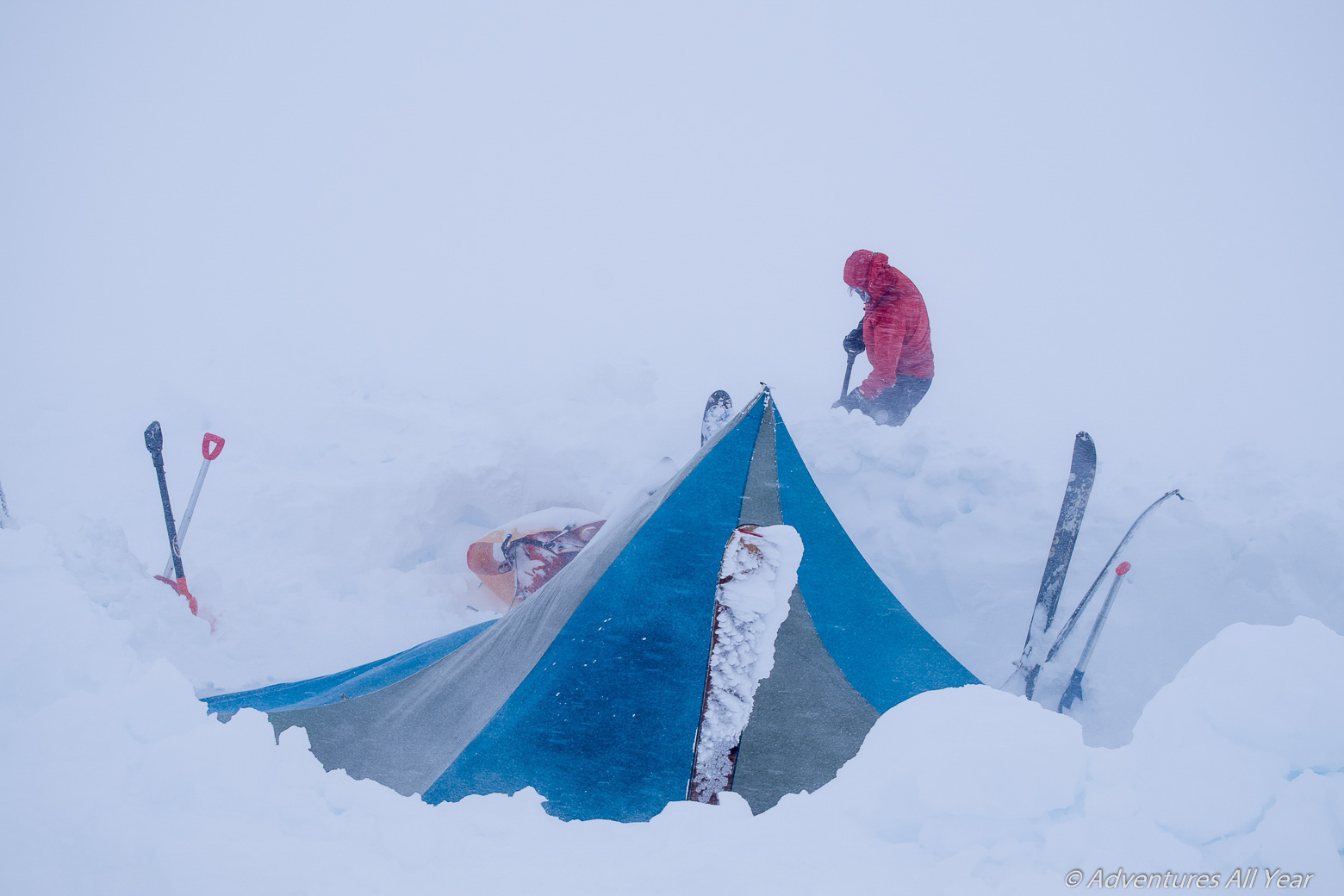 We wake up to an overcast day. While we pack camp the clouds descend and encapsulate us in their milky white. We manage to cover only 3km before we can no longer see anything. We make camp early that day in a less than ideal spot on an edge of some mountain. The visibility drops to zero. The earth and the sky blend in a uniform shade of white paint. We stake out a 10m safety perimeter around camp as we cannot decide whether we are perched on a cornice or a cliff. By late afternoon the weather sets in fully. It is blowing snow, light at first, then heavier and denser with each passing hour.