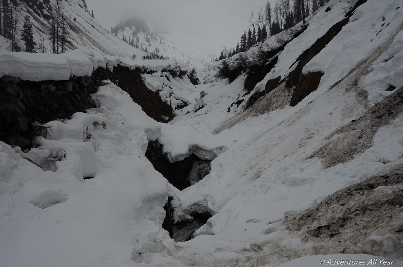 At some point the canyon walls close in and constrict us to a single passage. Here we are forced to descend to the creek level and cross it on a snowy pillow that miraculously remains, unmelted, in the right spot to allow us to cross to the other side. Here I experienced a true “engine-flush” – a rush of adrenalin when waterlogged soil in the gully we were crossing started to slide down in one muddy avalanche. I ditched the skis I had been carrying and only had a split of a second to roll to the side before the boulders shot past me. My skis were taken for a ride though and I had to, heart pounding, re-enter the unstable gully to retrieve them.