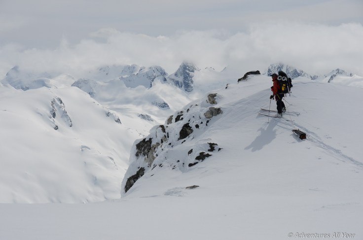 Mu Ridge is freaking scary. This is not the experience of previous parties, if you ask them, but for us it was a reach into the depth of one’s brave soul. This was due to the snow conditions – hard and frozen, no boot penetration, and to the fact that we were unable to really follow this undulating ridge. On multiple occasions we were forced to traverse its steep western slopes. I made a major mistake of not removing my skins for this traverse. Realizing that I would have better edge control without I was forced to remove them in a 45 degree slope. This took a lot of cursing and anxiety. The incline was so bad that I needed to peg my backpack down to the slope with an ice-axes to prevent it from tumbling into oblivion and was still sweating bricks that I would lose a critical piece of equipment. Stepping back into the stripped skis was almost as much fun, where Peter had to hold the ski for me to make sure it did not shoot down and out of sight forever.