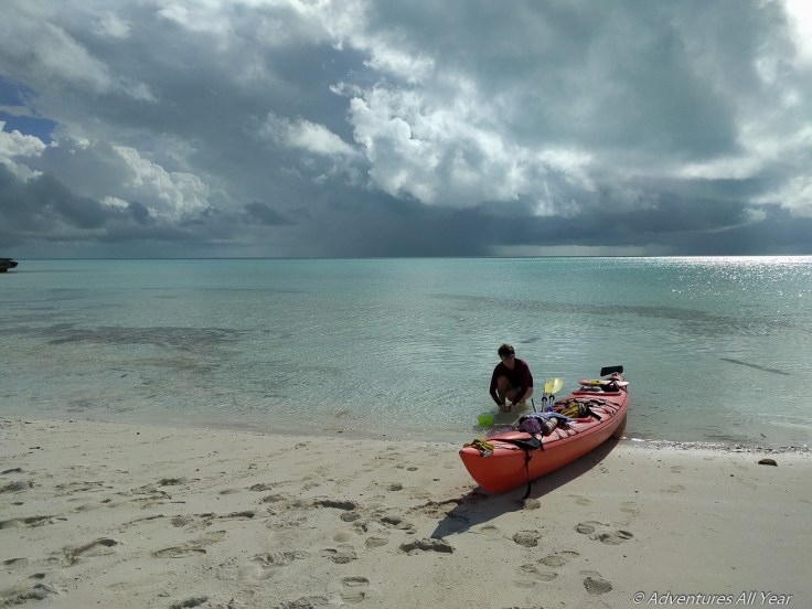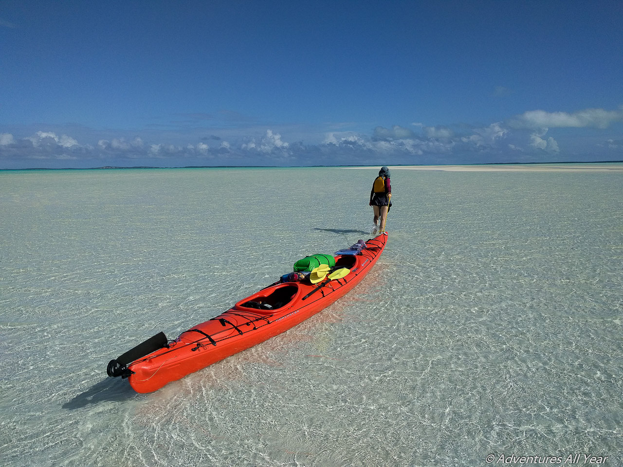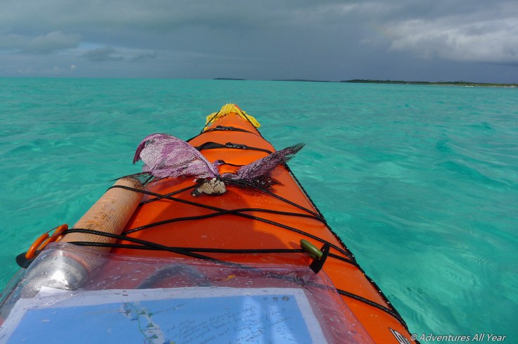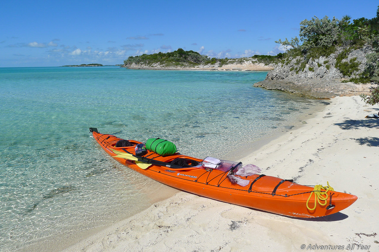 Logistics were a bit daunting because, you know, very few of the cruising crowd in Nassau are seeking to rent a kayak and go paddle unsupported for two weeks, so it took a while to locate a tour operator set up to rent seaworthy kayaks and let us take them overnight. There was pretty much only one in the Exumas – Out Island Explorers – and that’s who we went with. The thing with renting is that you never know what kind of a boat are gonna get . And in all honesty, I had some reservations about the kayaks we were provided. They did not have a centre hatch so packing 7 days of supplies was an issue plus they did not have a centre bulkhead so buoyancy was somewhat compromised. But having no choice and knowing that the cays were not going to be a super dangerous place to paddle, we accepted that fact. On the upside, this tour operator has some fantastic information on their website showing suggested routes, points of interest, possible campsites, complete with a map and GPS track and was very knowledgeable about the seastate and best places to go.