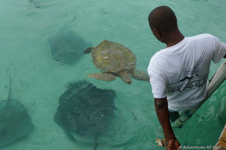 Feeding turtles in the Little Farmer’s Cay lagoon.