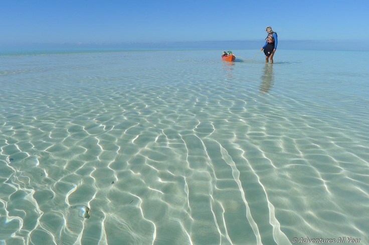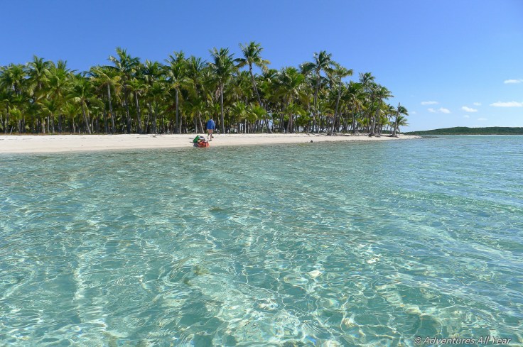 We are about 1 hour too late after low tide so the sandbank is, unfortunately now under water, but still only about knee deep so we get out of the kayak and walk about giddily in this eerie spot surrounded by water. As the tide rises the water washes over the sandbank faster and faster, it’s one of those spots where the strength of the current surprised me. So we hop back into the kayak and paddle fast back to the cays.