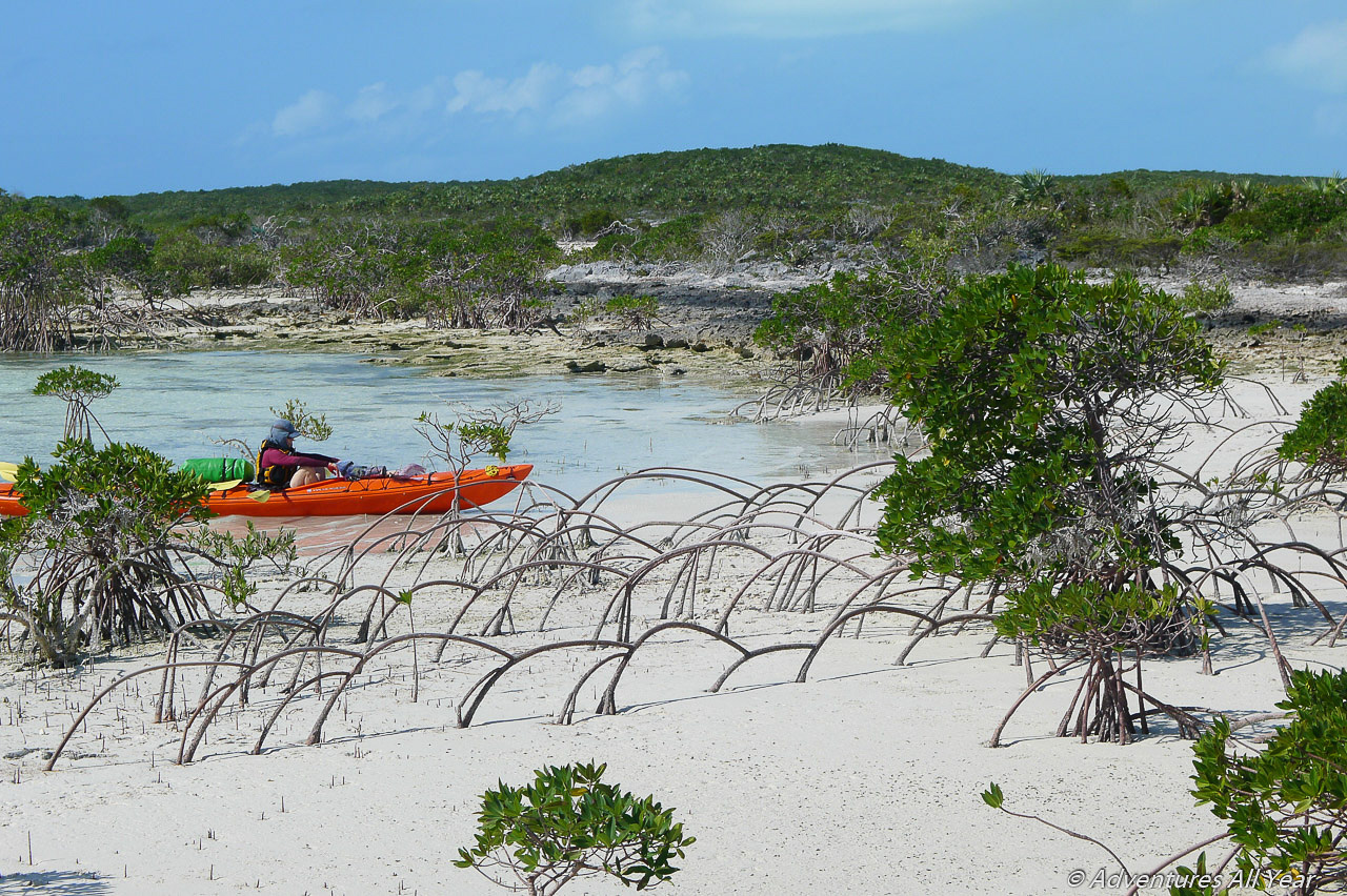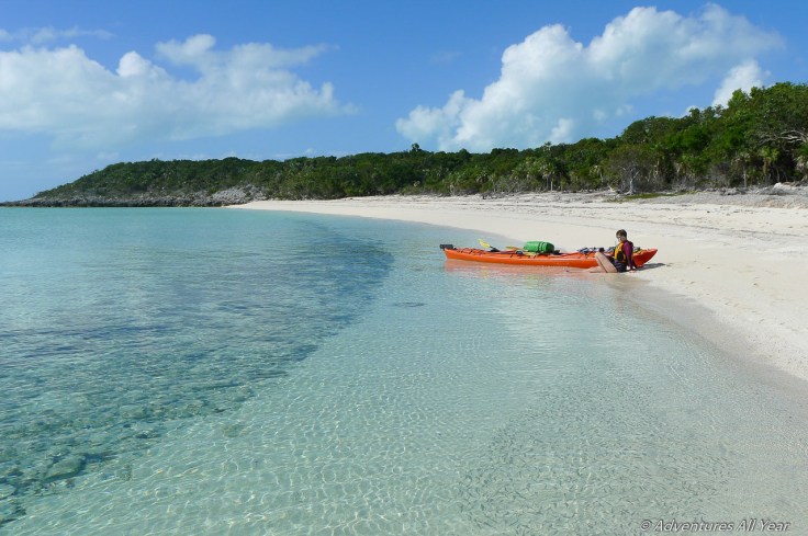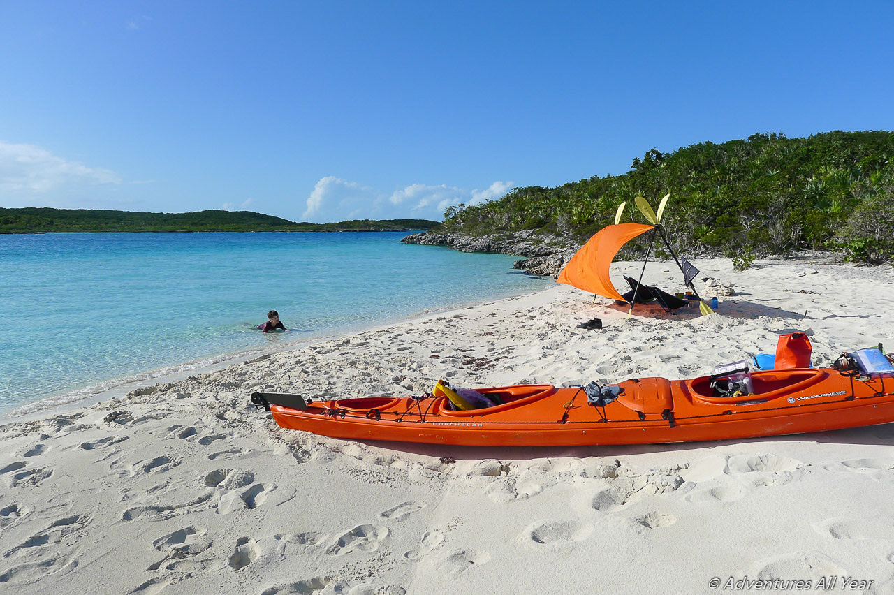 Exuma Sea and Land Park is a nature conservancy that protects ~100,000 acres of sea around the string of small islands (cays, pronounced as ‘keys’) stretching N from the Grand Exuma. The heart of the park (and the visitor centre) is on Waderick Wells Cay some 100km N of Grand Exuma, your likely starting point. The cays are exposed to the Atlantic Ocean on the east side but have very shallow, sandy seas on the west. Most people will sail or power-boat along the chain, kayaking is not a mainstream sport by any stretch of imagination. The islands are superbly photogenic, very tropical with white sandy beaches and blue calm waters.