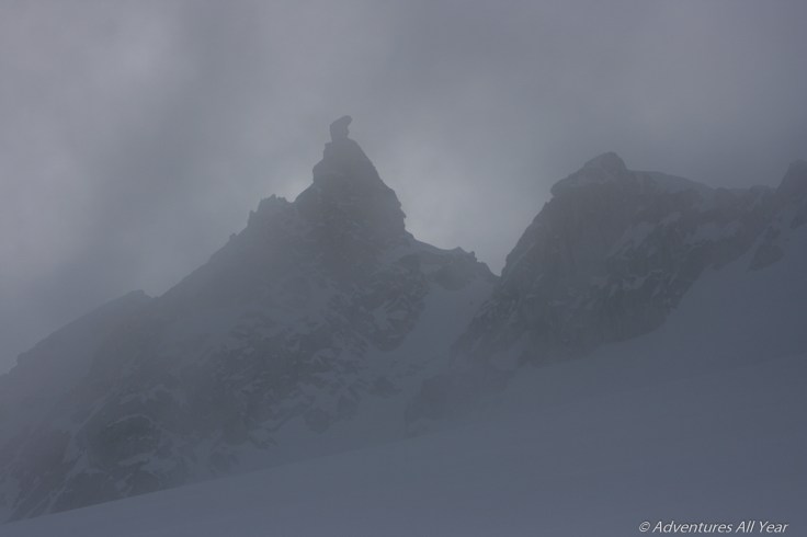 Our efforts now had us up on what is aptly named Sinister Ridge. Huge waves of snow to cross. Up one only to see another, then another. Up and down, up and down. Then half booting, half skiing down a steep rocky ridge drop off. Still following the general ridge top we kept on. And we were starting to really lose our visibility with the forecasted clouds coming in and the wind picking up along with it. Fortunately, just when we thought that we were done, a break would come and we could once again see our way. Then Hour Peak opened up for a moment. We were to go up and around it’s eastern side to access the Mt Luxor-Crosscut Ridge col. Firstly though, there was one more obstacle. A steep face to descend with. Once again 4 of us booting it down, and Peter and Silke side stepping down with their skis on.