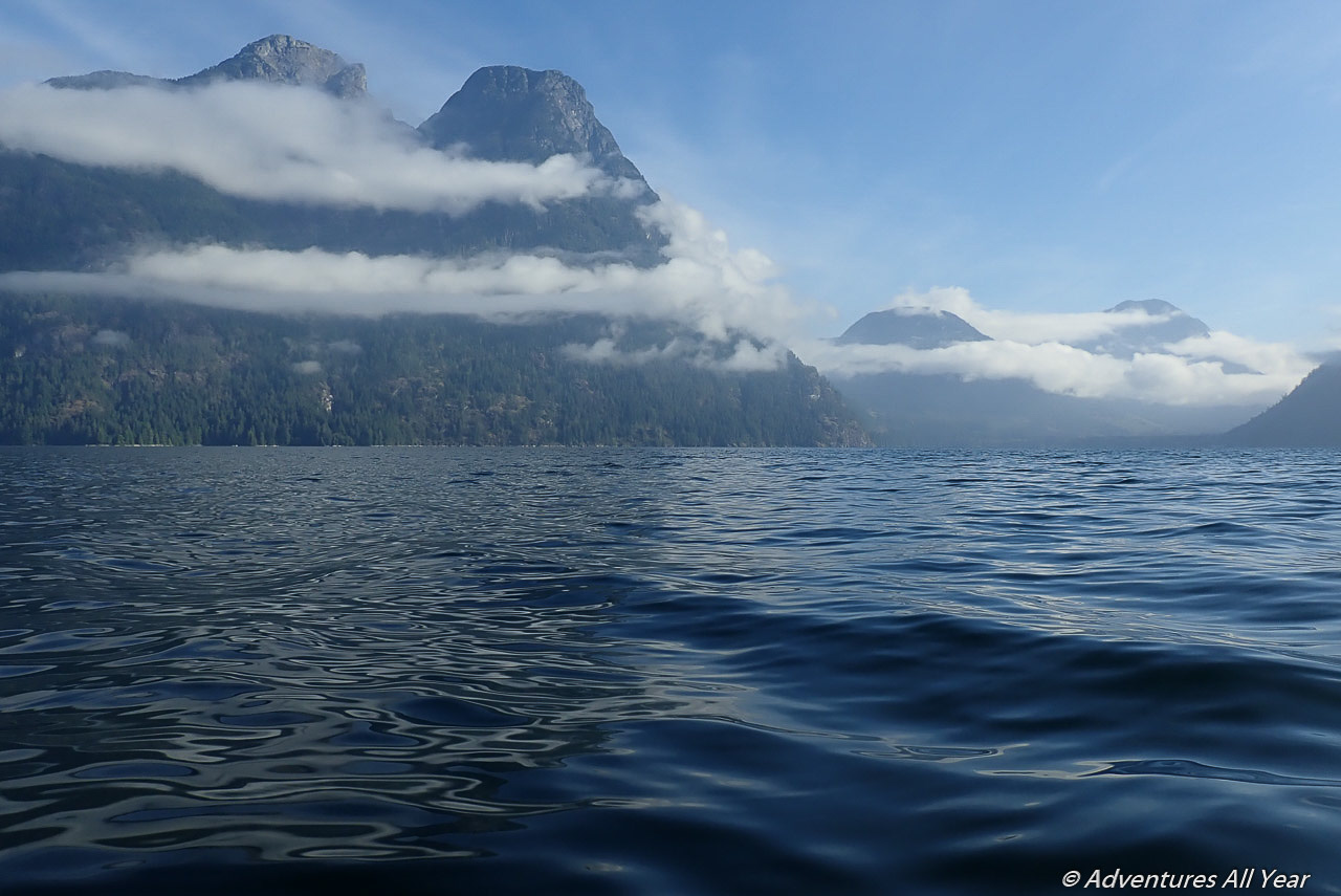 Leaving the mouth of Sechelt Inlet and turning north we are immediately greeted by impressive views of Mt. Churchil and Mt. Spencer, peaks with 1,500m prominence above water. There is an occasional small motor boat traffic but otherwise we have this place to ourselves.