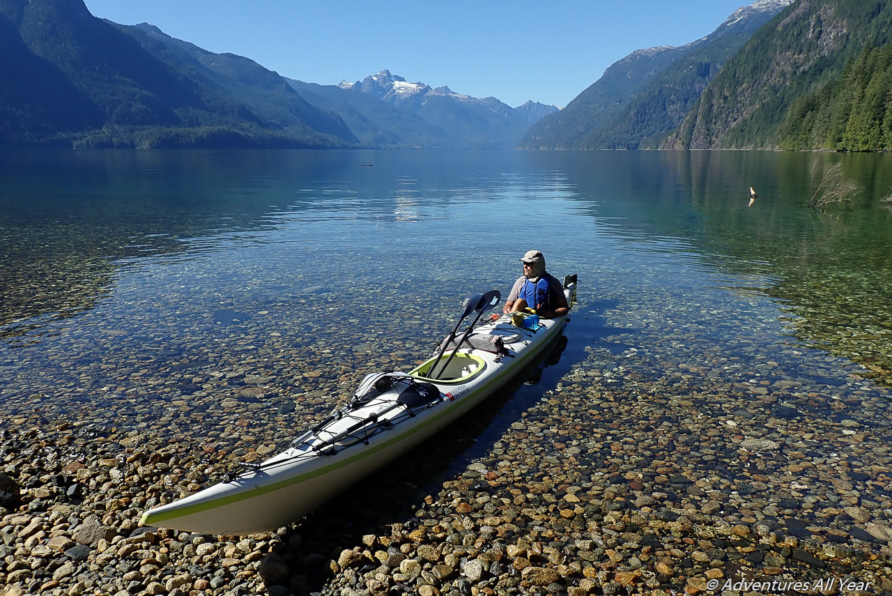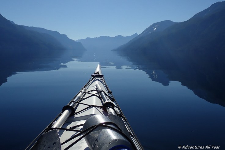 We had 8 days in total available for this trip and some gorgeous weather – 8 days of sunshine and not a ripple except for one windy day. This was an unbelievable weather fluke as these long inlets are known for ferocious katabatic winds that gather strength in the mountains and then funnel through the inlet at 35 knots. Beware of the katabatic winds, they can literally make it dangerous or impossible to paddle.