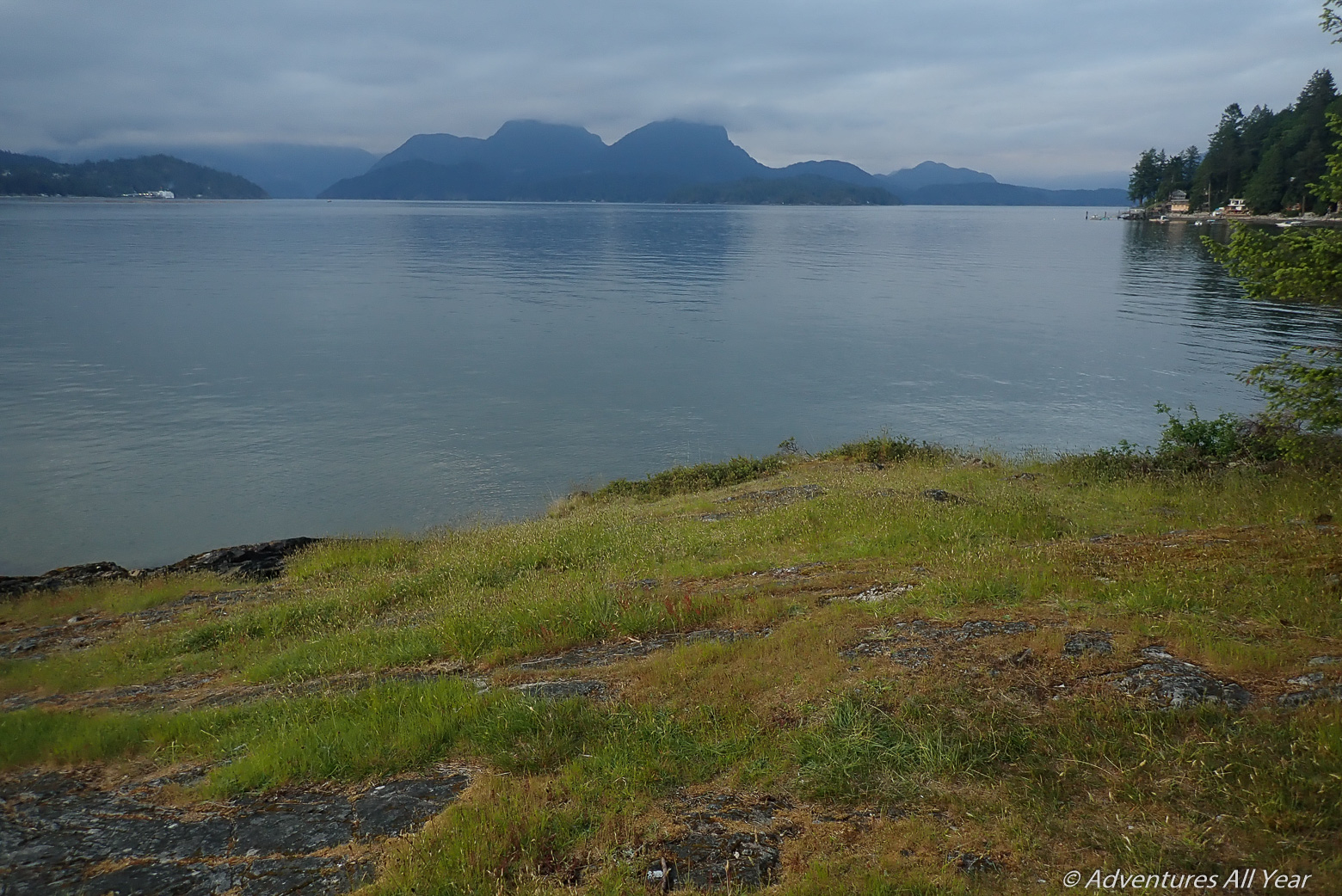 Rounding the N tip of Gambier Island we are back into the familiar waters with Anvil Island coming into sight. There are two possible places to camp along this side of Gambier: a grassy clearing at the mouth of Gambier Creek, a.k.a. Douglas Bay – an attractive, open spot; and at Ramillies Channel provincial recreation site, a maintained site with tight camping spots but a really nice outhouse and a pleasant pebble beach. Lots of beaches along this shore and further south have been historically used by the local first nations for camping and gathering.