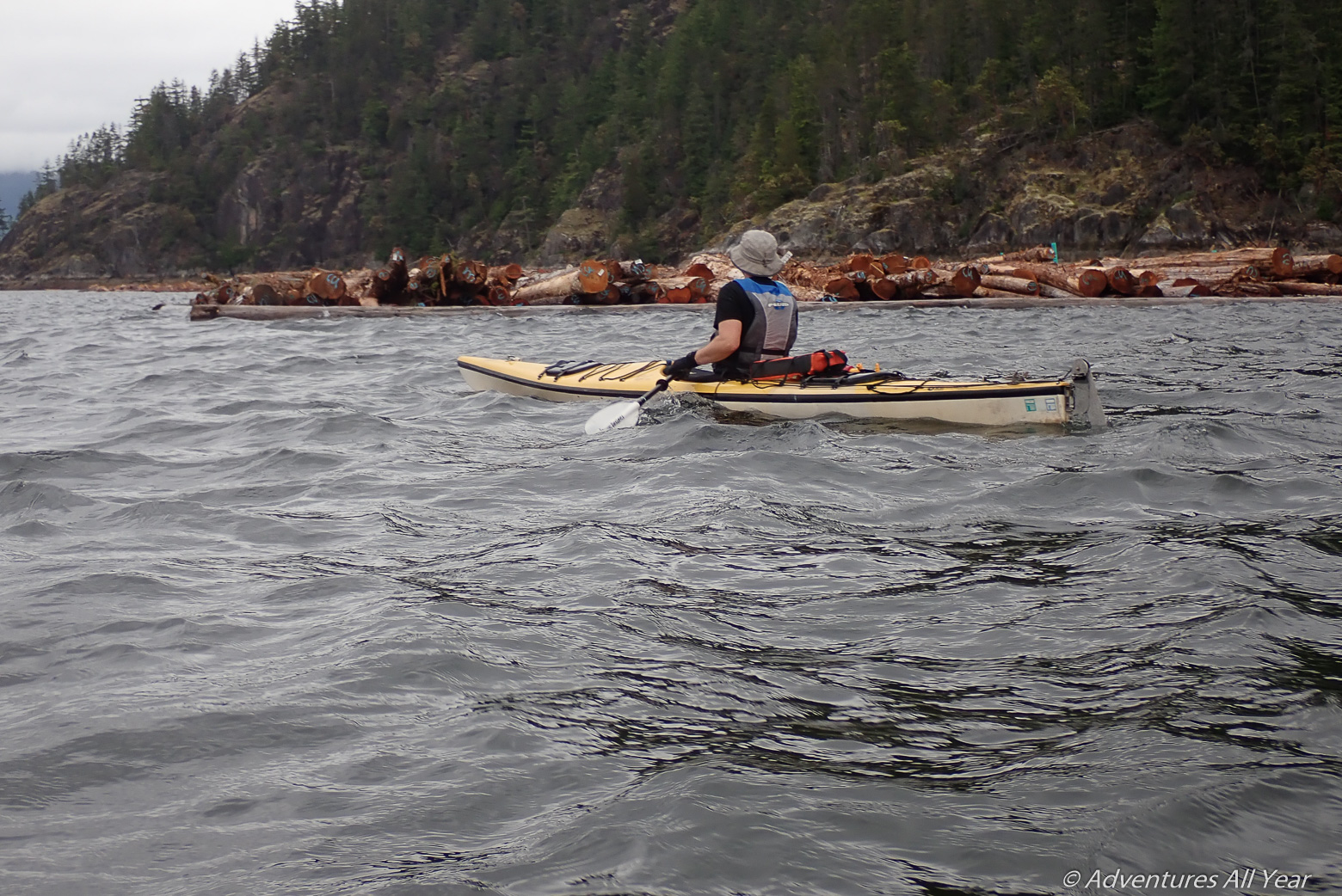On Day 3 we head up Thornbrough Channel, having to cross the ferry route once more but once past Langdale ferry terminal we’re out of sight and into unknown waters. Protected from view by large Gambier Island, this channel rarely sees recreational traffic. Fringed by log dumps and dominated by Port Mellon pulp mill it holds little visual attraction but is nevertheless an interesting place to paddle, if for nothing else then for the mere novelty of it. I have seen Thornbrough Channel from high above before, looking at it from the summit of Mount Eplhinstone, and I must say that the colour of the water is astounding – that turquoise green that only glacier runoff can produce. From the water level, however, we do not see the hue and so just paddle along observing the unknown coast.