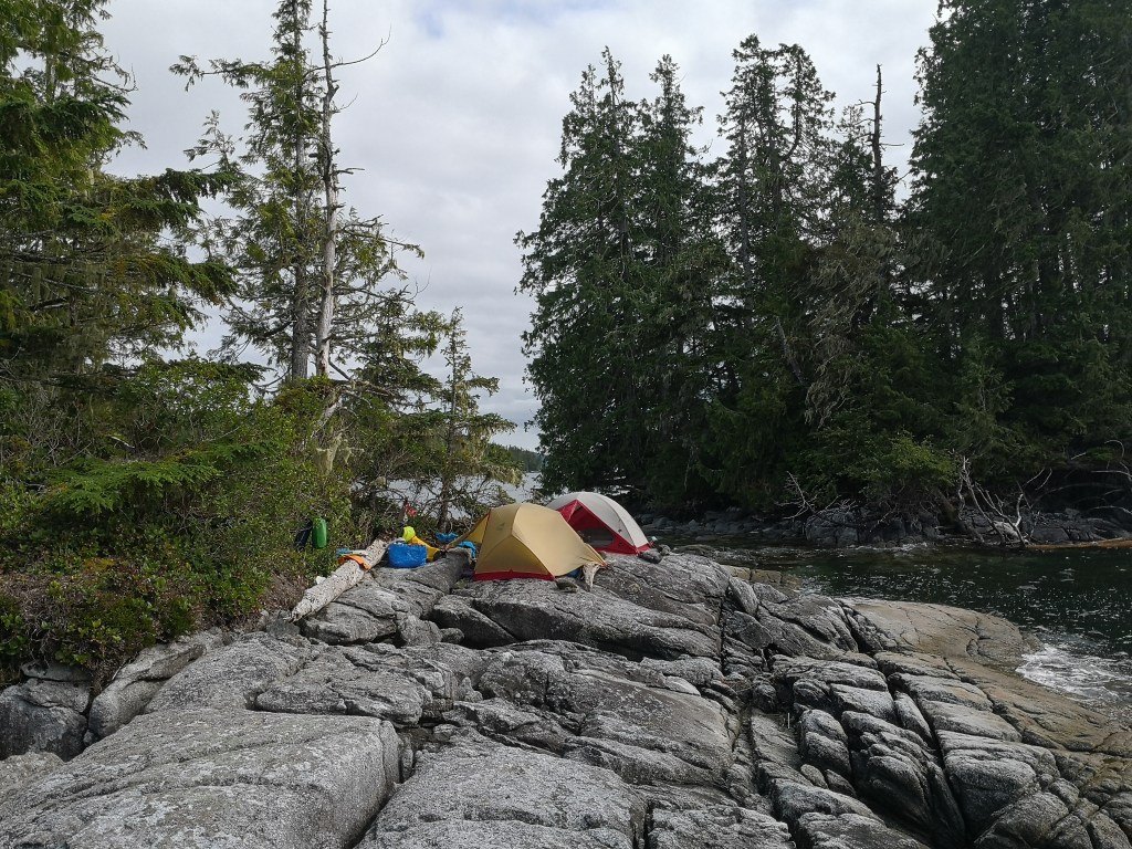 That night we set camp amongst small islets off Edmund Point, just where Burke Channel (leads up to Bella Coola) turns east and away from Fitz Hugh. We spend a good hour looking for where exactly the campsite is because the islets are so small that there is certainly no way we can all fit here. We eventually settle on a small shell tombolo between two islets but is is so tiny that we are having tough time fitting the tents PLUS the boats onto the small neck of dry land. Our challenge was that at the time when we were there the moon cycle was such that we were still having 4.5m tides at night and that eliminated a lot of the usable space. But what we had available to us was super picturesque.